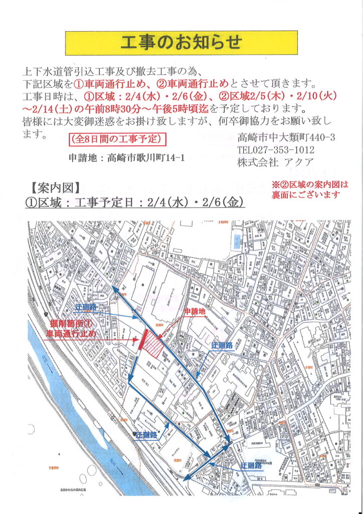 以下の期間と道路で午後5時頃まで、道路工事による通行規制があります。